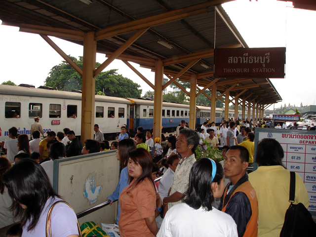 Rond acht uur was de trein gearriveerd en was het haasten voor een zitplaatsje. Maar na veel duw en trekwerk hadden we allemaal een plaatsje in de trein kunnen bemachtigen. Voordat de trein het station verliet, werd nog het Thaise volkslied gedraaid. Hierbij stond iedereen netjes op.