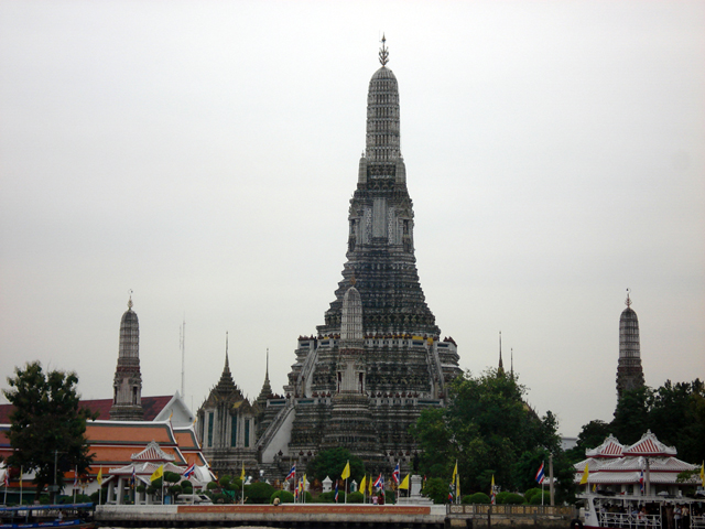 Arun. Deze ‘tempel van de dageraad’ lag aan de andere kant van het kanaal en met een pontje zijn we naar de overkant gevaren. Het bijzondere van Wat Arun was dat de tempel en bijbehorende torens bekleed zijn met porselein. Via een van de vier steile trappen zijn we naar boven geklommen en hadden ook hier vandaan een mooi uitzicht op de omgeving, met in de verte het dat van het koninklijke paleis.