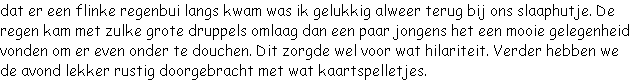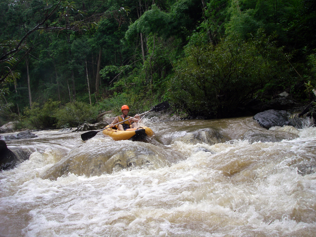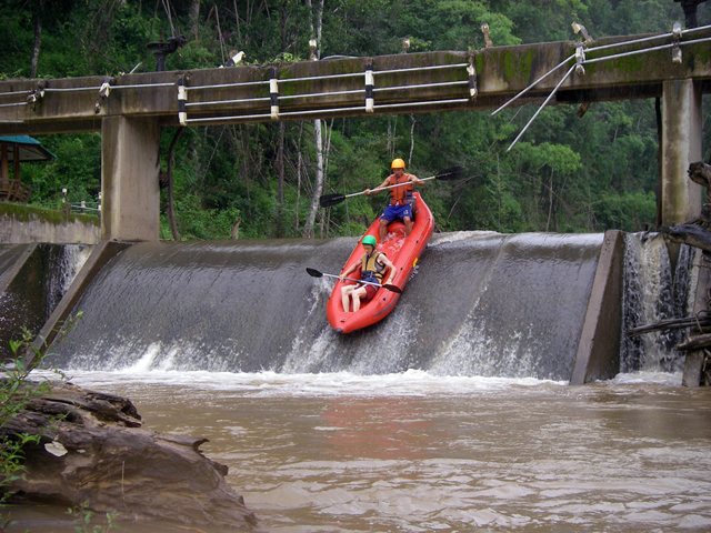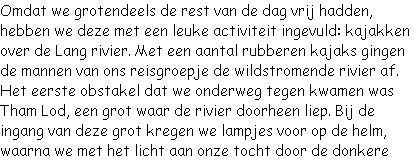 grot vervolgden. Een belevenis op zich. Vervolgens kwamen we bij een dam. Hier hadden we een verval van ongeveer 3 meter. Iedereen kwam hier goed doorheen. We voeren verder over diverse ruige stroomversnellingen, waarna we na ongeveer 7 kilometer eindigden bij een tweede dam. Hier werden we netjes opgehaald en terug