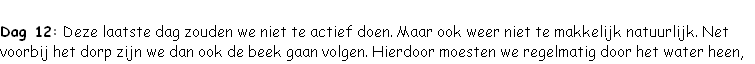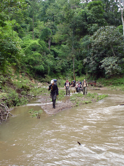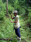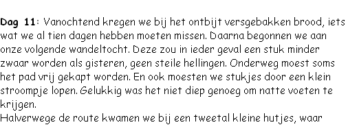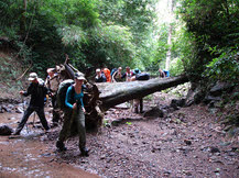 uitzichten over de omgeving. Daarna ging de route langzaam omlaag door een dicht bos heen. Hier moest de weg ook op diverse plaatsen vrijgemaakt worden met de machete. Het pad was zelfs zo onbegaanbaar dat we bij een heel stuk zelf onze route moesten maken.