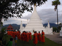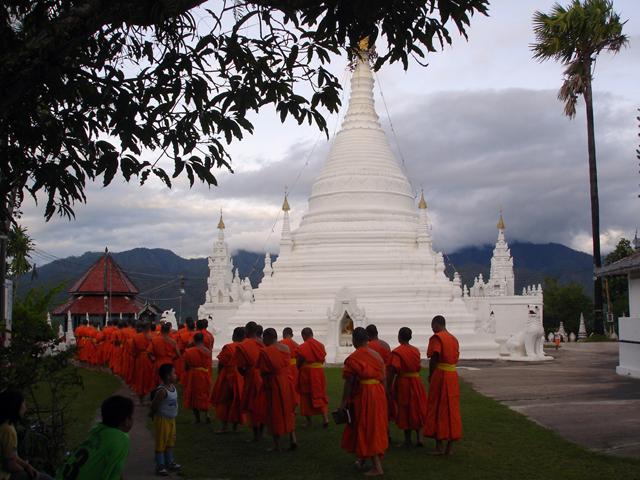 In de middag hebben we het dorp bekeken. Mae Hong Son is een nog redelijk rustig dorp. Omdat ik nog wat tijd over had, ben ik nog naar Wat Pra That Doi Kong Mu gelopen. Om hier te komen liep er een pad van onderaf de heuvel naar boven, waarbij in de bochten enkele treden zijn aangebracht. Eenmaal boven had ik een mooi uitzicht over het dorp