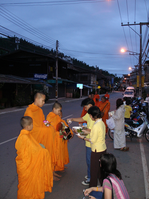 ’s Ochtends hadden we nog de mogelijkheid om de bedeltocht van de monniken te zien. Elke ochtend na de ochtendmis komen de monniken langs voor eten. Toeristen kunnen eten kopen, welke ze dan geven aan de langskomende monniken. Ook geeft de bevolking zelf eten weg. Als eerste kwamen diverse kinderen (ook monnik) langs. Later kwamen ook de volwassen monniken langs.