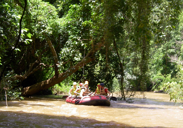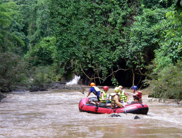Na een tijdje kwamen we bij de kruising met de Pai rivier. Hier werd het ook een stuk breder. Hier hadden we ook weer de mogelijkheid om te zwemmen. Na wat aanmoediging van mijn kant (ik trok ze gewoon uit de raft), kwam ook de rest het water in. We dobberden zo verder naar onze eerst stopplaats bij een hot spring.