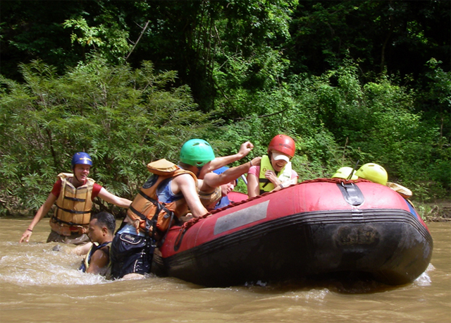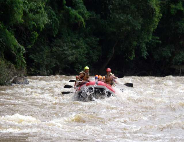 Tijdens het volgende stuk kwamen we langs wat ruigere stroomversnellingen. Bij een van deze wilde waterstromen kwam onze raft verkeerd te liggen. Hierdoor werden we terug gezogen naar de waterval en bijna omgegooid. Ik zag daardoor twee anderen verdwijnen in de witte massa, voordat ik zelf in het midden van de raft werd gegooid. Door het trillen van de stroming kon ik moeilijk overeind komen. Dankzij een andere raft kwam de boot weer vrij van