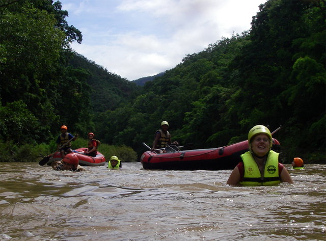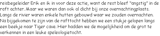 Wat bleek: onze stuurman/gids was ergens aan de kant beland en de rest van mijn groep dobberden al verder stroomafwaarts. Ik was als enige in de raft gebleven. Nadat eerst de gids weer aan boord was, hebben we met zijn tweeën de rest van de bemanning opgepikt.