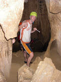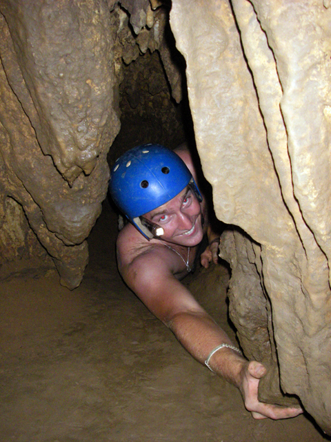 zanderige ondergrond kwamen. Om verder te komen moesten we hier tijgerend en schuivend onder de rotsen en tussen de kieren door verder de grot in. Tussen de moeilijke stukken waren ook gedeelten waar je redelijk makkelijk kon lopen. Toen we na een kwartier (wat vele malen langer leek) stopten, deden we onze lampen uit zodat we zaten in