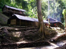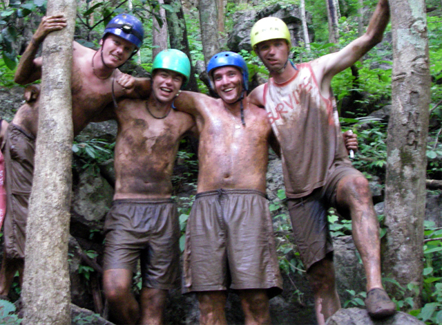 complete duisternis. Zelfs je hand voor je ogen halen was niet te zien. Na dit meditatiemoment zijn we via dezelfde weg terug gegaan. Eenmaal buiten was pas duidelijk te zien hoe modderig het er binnen was. We kwamen dan ook als aardmannetjes buiten.