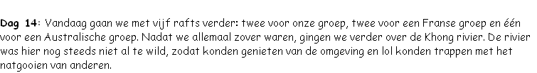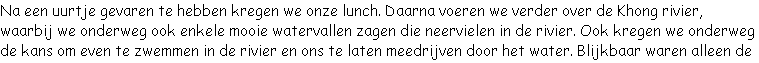 Het eerste stuk van deze tocht liep over de Khong rivier. Hier kwamen we diverse wilde stroompjes tegen die we met redelijk veel gemak konden nemen. Onze gids was waarschijnlijk wel erg op de natuur gesteld, want hij zocht bijna elke tak op die boven het water hing.