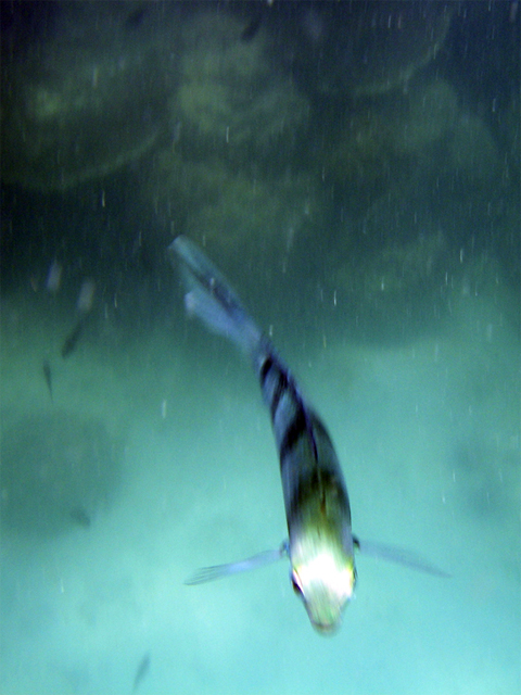 verdwenen door de toegekomen wolken. Na de boel in de boot gedaan te hebben zijn we naar een tweede locatie gevaren. Hier gingen we direct weer duiken. Via een touw daalden we weer af. Hier gingen we in groepjes van twee verder. We zwommen rond een rotsachtig eiland waar ook