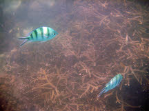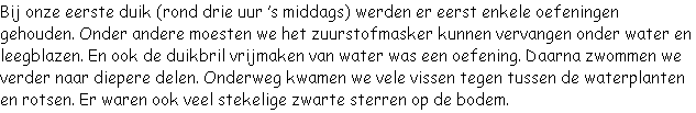 weer vele vissen en schelpdieren waren. Onderweg was het stil en rustig tot we opeens alle anderen tegenkwamen. Maar na een korte drukte met allerlei zwemmende mensen, konden we weer van de omgeving genieten. Maar na een tijdje kwamen we ook hier weer boven.