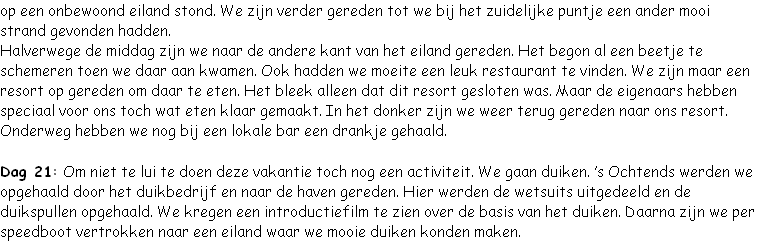 Na een uurtje werden we eindelijk opgepikt en voeren we door voor ons duikavontuur. Na eerst de ervaren duikers overboord gezet te hebben zijn we naar een strand gevaren. Hier zouden we onze eerste les krijgen. Bij