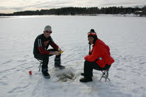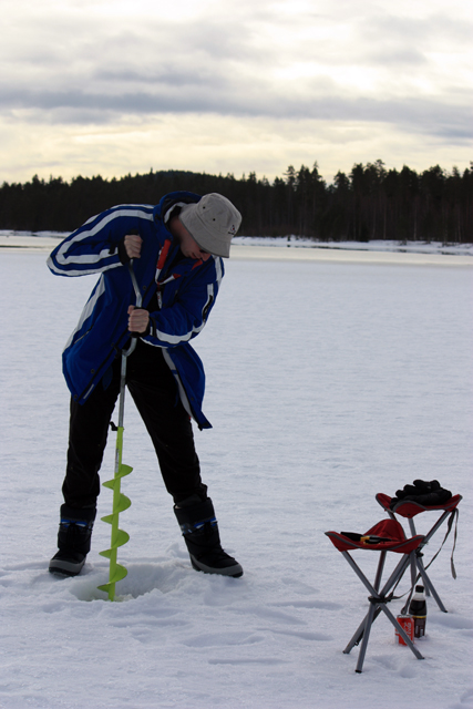 Na het ontbijt zijn we naar het meer Örklingen gelopen. Alle spullen stonden al klaar voor het ijsvissen. We kregen kort de uitleg hoe mensen een visplaats creëerden. Hierna mochten we dit zelf doen.