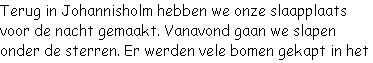 bos om voor iedereen voldoende dennentakken te verzamelen om als slaapmat te gebruiken. Als dak gebruikten we een grote dennenboom. Anderen maakten een groot nest op een open vlakte of hadden een hut gebouwd.