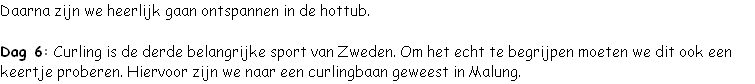 Dag 7: Langlaufen is de sport van Zweden. Dit kan dan ook niet ontbreken op deze reis. Na eerst de materialen opgehaald te hebben bij de skipiste, zijn we naar Mora gereden. Op een oefenbaan werden de grondbeginselen van het langlaufen ons bijgebracht. Daarna deden we een kort rondje door het bos. Dit was voor iedereen wel goed te doen. De wat actievere onder ons zijn daarna een route van 2,5 km gaan lopen. Deze liep deels ook over het pad van de Vasaloppet.